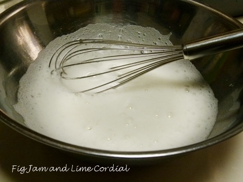 3. In a separate mixing bowl and using a hand whisk, beat the egg whites for about a minute until they’re frothy, but not stiff. They should look like this…