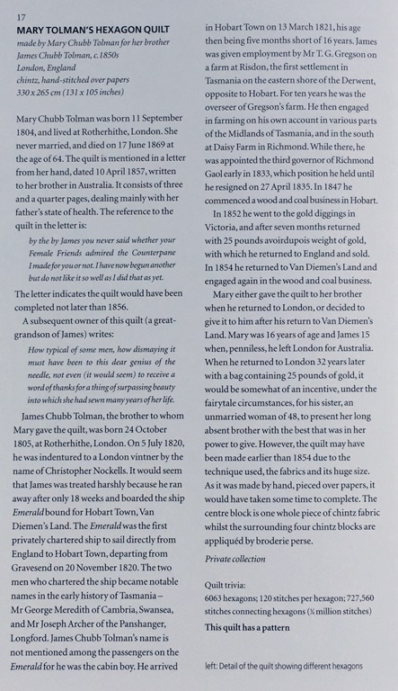 Mary Chubb Tolman’s humungous hexagon quilt was made sometime prior to 1857. It boasts 6,063 hexagons and an estimated 750,000 hand stitches. I’m including the story that accompanies the quilt so you can get some sense of how the book is laid out.