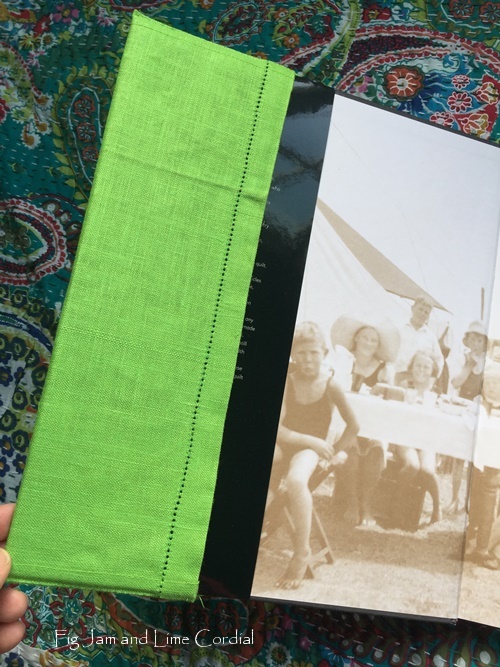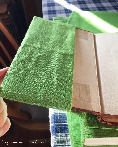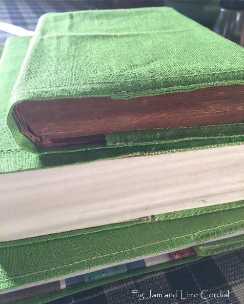 I recently covered my new quilting book, The Fabric of Society, in the same green linen (I’d bought a set of six) and I’m honestly enjoying it even more as a result. I initially tried leaving the dust cover on underneath the fabric one, but decided in the end to take it off…