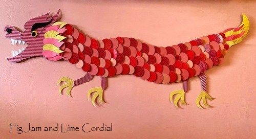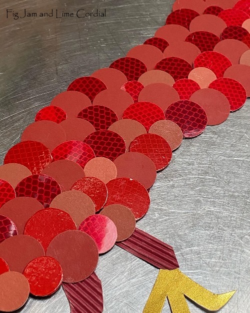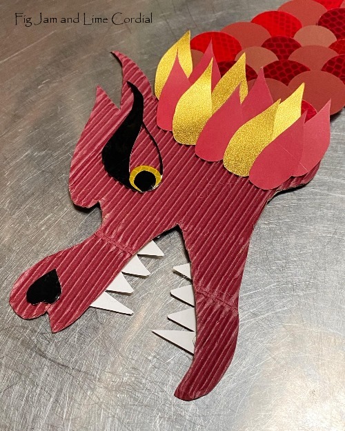 Finally, I made a paper dragon for Chinese New Year! I’ve wanted to make one for years, but I could never figure out how to do it. Then last month I came across rolls of industrial adhesive reflective tape going for a song at Reverse Garbage. On the same visit, I also found red corrugated cardboard and assorted cutout circles, and a project was born…