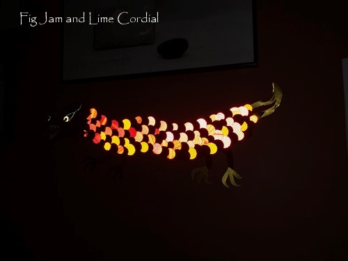 Big Boy and Monkey Girl were roped into helping over dinner. They made the talons, mane and tail, I hot glued all the discs in place…et voila! We’ve named him Falkor after the luck dragon in The Neverending Story…
