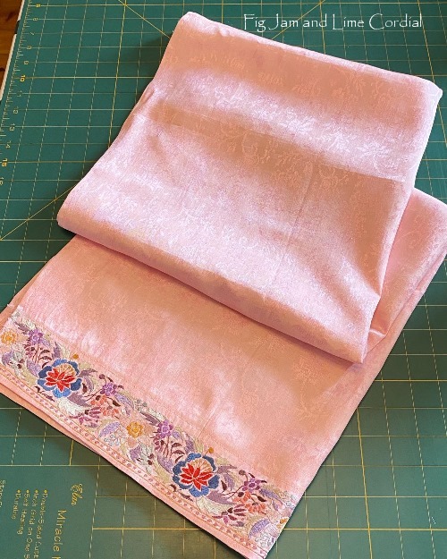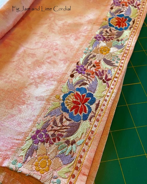 I’m also a bit obsessed these days with vintage fine needlework – this piece of Chinese silk languished in my stash for years until my clever friend Mark suggested a way to use it. The delicate hand embroidered design lay in the middle of the strip, but Mark suggested carefully cutting it in half, sewing the opposite ends together, and creating a pashmina with border detail…