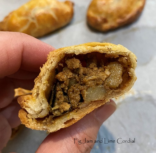 It’s an intriguing method for making curry puff dough from Nyonya Cooking. Traditionally, this pastry is tricky to make – two types of dough are made and then laminated together to achieve the necessary flakiness. By contrast, this is the easiest pastry I’ve ever tried and it’s made in a completely different way – HOT oil is added to the flour, followed by COLD water. The link above has more information, including a video on how the dough is made. The oil appears to cook the flour a little first, making the pastry pliable and easy to manage.