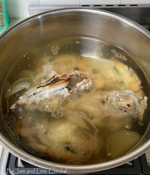 Step 2: the carcasses then went into our large stockpot with a knob of peeled ginger, a sliced onion, a tablespoon (four teaspoons) of flossy sea salt and five litres of water. It was brought to a boil covered, then simmered covered for 30 minutes. The heat was then turned off, and the pot allowed to sit covered for a further 30 minutes.