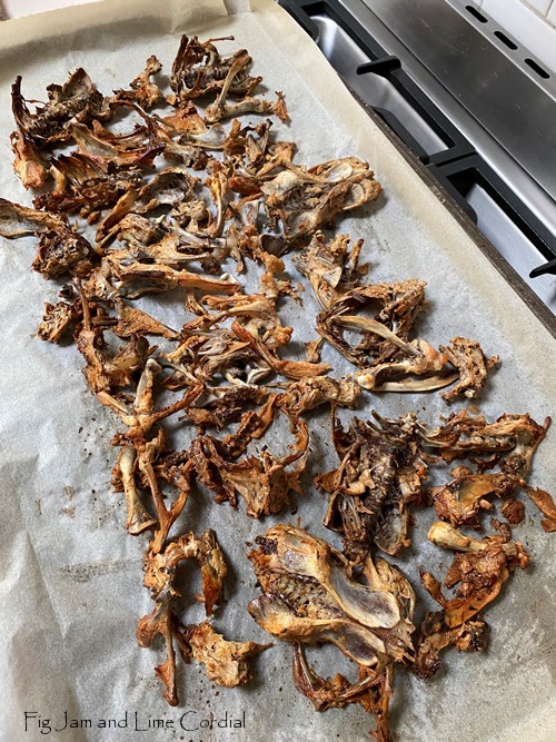 Step 5: (and this is where it gets exciting) after picking the meat off the bones, we broke them up and roasted them in a hot oven (200C – 220C with fan). They took about 30 minutes to dry out completely but Pete kept a close eye on them – they needed to be very dry to the point where they were just starting to burn around the edges (see photo below)…