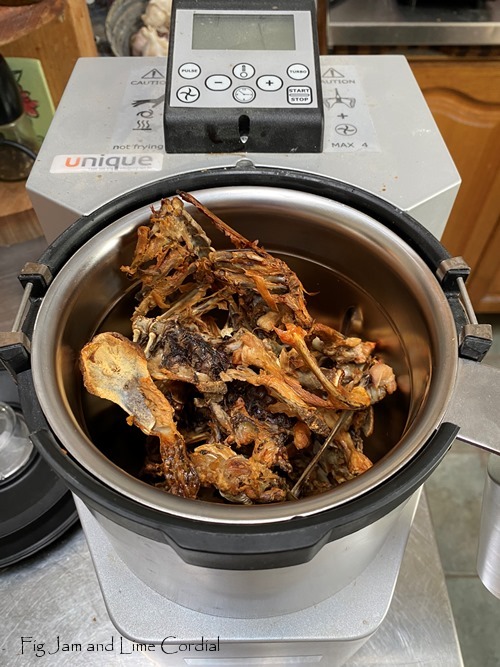 A side note: this is now my preferred method of making chicken stock. I don’t boil it for hours or use a pressure cooker any more, although I’ve done both in the past. I’ve found that roasting the bones first and simmering covered for just half an hour produces a lovely, full-flavoured stock and plenty of it – I ended up with a full five litres (possibly a bit more) for the freezer. The shorter cooking time is more energy efficient as well.