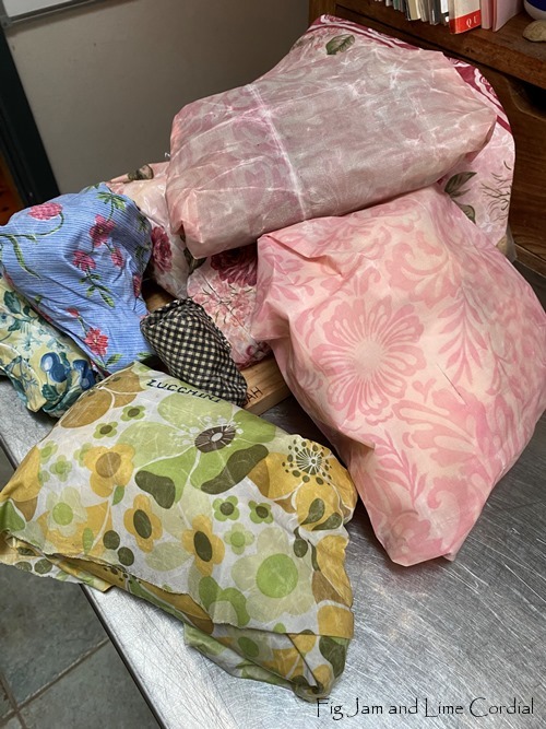 As I mentioned in last week’s post, I recently spotted a packet of three small wraps (11″ square in imperial terms) for $39.95. That’s too small to wrap one of my loaves of sourdough or a bunch of snake beans from the garden…