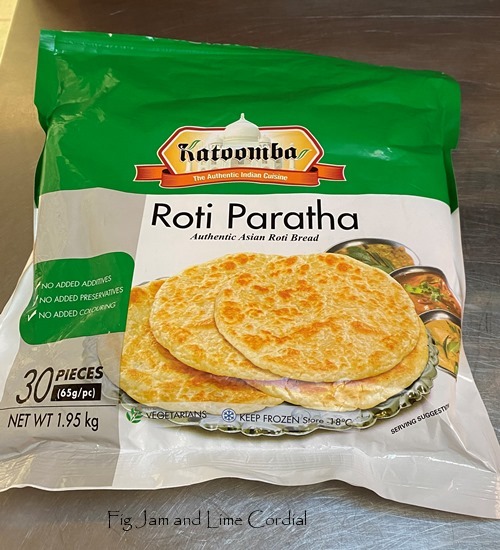 Have you ever tried these? They’re wickedly good. They fry up in a dry pan to make the perfect accompaniment to Indian and Malaysian curries. Of course, they have a squillion calories each, although an Indian friend once told me that they’re much better if you fry them in ghee (I’ve never been game to try it). Our local takeaway turns them into wraps – filling a cooked roti with curry and salad – and it’s a completely delicious and brilliant way to eat them.