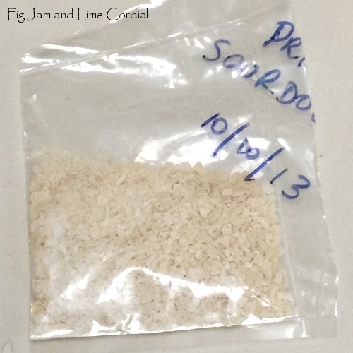 In dried form, the starter can last for a very long time. A couple of days ago, I found this packet from October 2013 tucked away in the fridge…