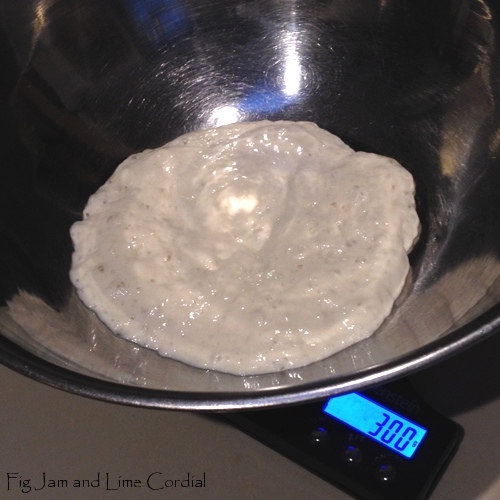 Always start with a bubbly bowl of starter. I take out ½ cup of starter from the fridge at lunch time, feed her ¼ cup each of bakers (bread) flour and filtered water at 1pm, followed by ½ cup of each at about 4pm. By 8pm, this is what she looks like…
