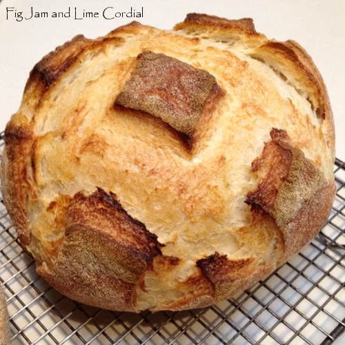 I couldn’t get any photos of the next bit (and no-one was awake to help me). Carefully take the hot pot out of the oven, remove the lid, place in the slashed dough, then cover and return to the oven. Reduce the heat to 220C with fan and bake for 20 minutes with the lid on.