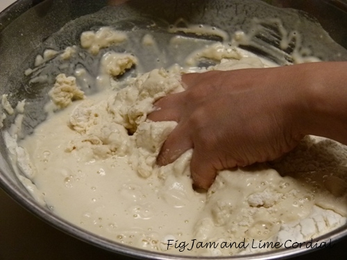 2. Add the cold water, and mix the ingredients together to form a sticky dough. It’s easiest if you do this with one hand, so you can hold the bowl (or answer the phone!) with the other. Really squelch the mix through your fingers until evenly combined. Scrape off your hand and cover the bowl with a tea towel. Allow to rest for 15 minutes.