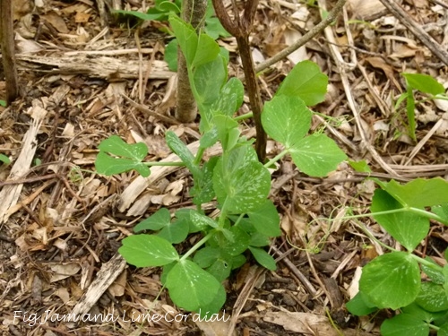 Many of the plants are self-sown, although we did deliberately plant the peas below.  This variety (Willow) is supposedly mildew-resistant, and they’re growing from seed this time rather than seedlings.  Their variegated leaves are very pretty!