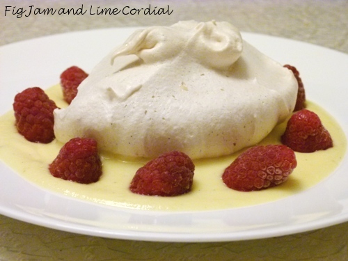 …is an easy mid-week dessert – meringues with microwave custard and frozen raspberries…