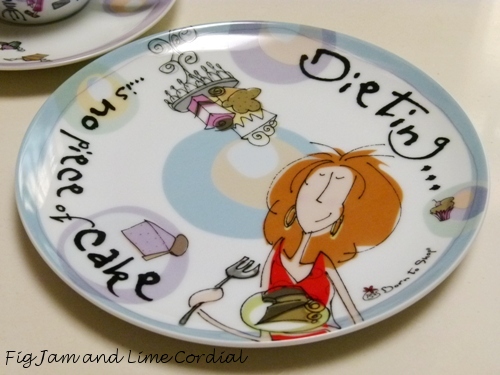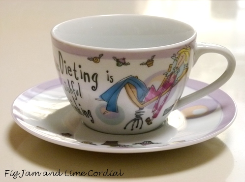 …the plate came with a matching teacup and saucer that says Dieting is Wishful Shrinking. So true, so true…