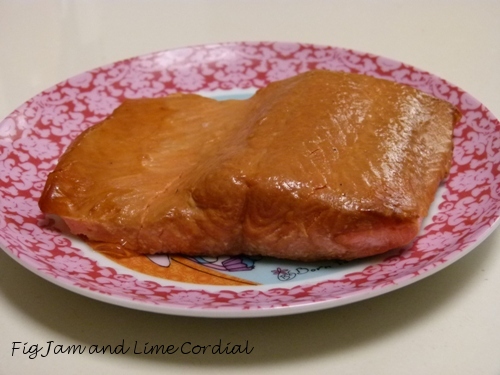 …is a large slab of salmon, smoked by our neighbour Ellen. The Neighbour Ware is not only coming back, it’s coming back with food on it…
