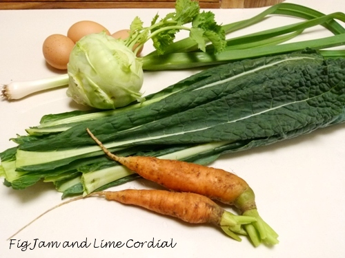 …is Wednesday’s harvest – carrots, Tuscan kale, a perennial leek, white kohlrabi and three eggs…