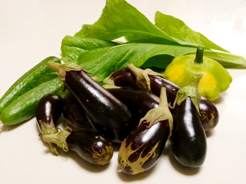 …and Thursday’s harvest – self-sown endive, cucumbers, a patty pan squash and lots of small eggplants…