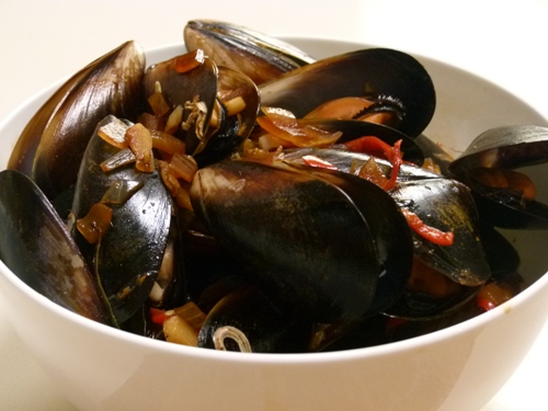 …are black mussels, cooked with soy, ginger and chilli. An easy and surprisingly economical meal!