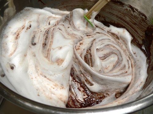 4. Beat in the eggs one at a time, working quickly so that you don’t end up with scrambled eggs. Add the flour, and stir vigorously for one minute (this bit is important) – the mixture will change from grainy to smooth and glossy in that time.