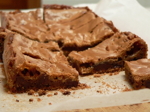 Expect these to be flat and ugly, and to crack as they’re sliced (use a sharp, thin knife). Also expect them to be deliciously moreish with a brown sugar caramel flavour and a fudgy, gooey centre. Enjoy!