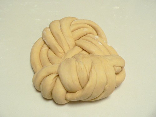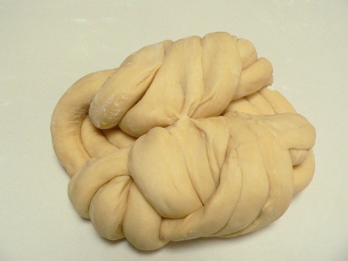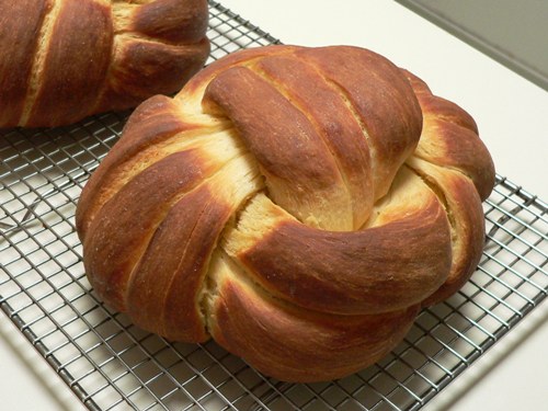 …are challah loaves, my contribution to the Mellow Bakers’ October bake-off. This Jeffrey Hamelman recipe uses two whole eggs and four egg yolks, resulting in a golden crumb. In addition, eggwashing the crust gave it an amazing glow – as Joanna pointed out, it’s a little reminiscent of polished antique wood!