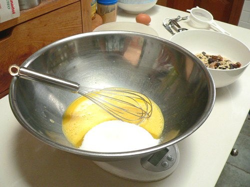 3. In a large mixing bowl with an electric mixer, beat the 3 eggs and sugar together until well combined, then gradually add the flour mixture, beating until all the flour has been incorporated. Turn the mixer to low and gradually mix in the nuts and inclusions.