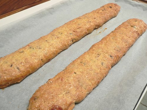 If desired, the finished biscotti can be given a coating of tempered chocolate, as the chocolate and ginger version below has been.
