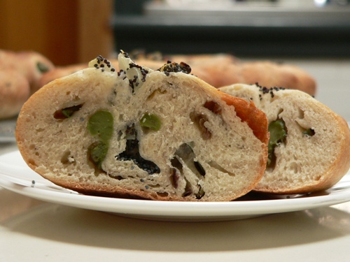 A recommendation to my breadbaking buddies – bake these as soon as possible! They’re easy, quick and truly delicious. My breads are usually chewy, hard crusted sourdoughs, so these made a nice change and the boys devoured them in record time. The photos here are of my second batch – baked this morning at Pete’s request.