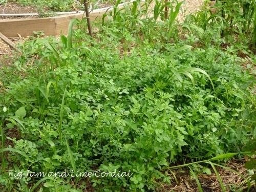 A portion of each bed is given over to growing chook food, and the lucerne planted here has taken off…