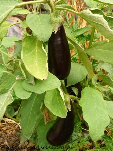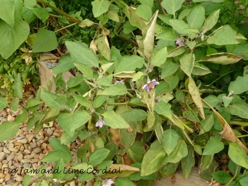Our poor eggplants, after doing so well all year, suffered badly from the lack of water. Yet after just a few deep waterings, they’ve started flowering again! You can see the curled brown leaves, and the new growth starting to come through…