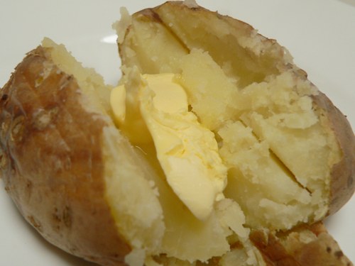 The spuntas are white skinned with yellow, floury flesh. To ensure a fair taste test, I pricked the skins and dry-roasted them in a hot oven. They were absolutely delicious with a little butter and salt…