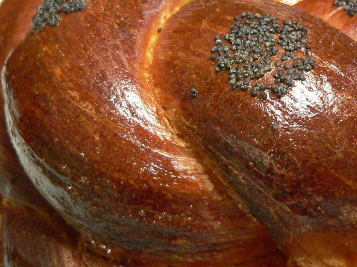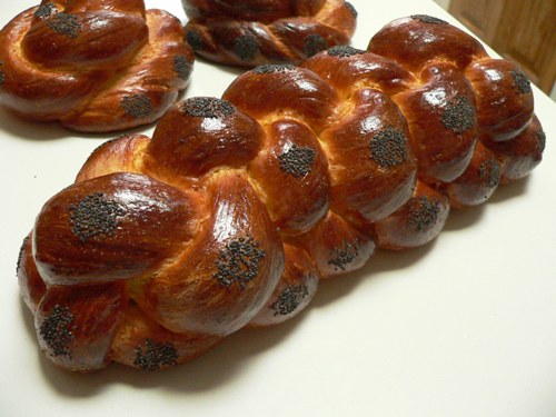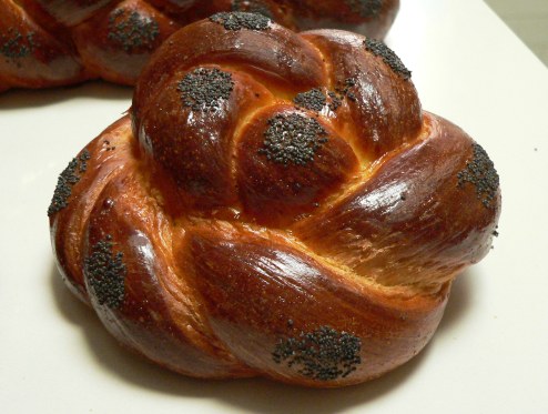 …are challah loaves, my contribution to the Mellow Bakers’ October bake-off. This Jeffrey Hamelman recipe uses two whole eggs and four egg yolks, resulting in a golden crumb. In addition, eggwashing the crust gave it an amazing glow – as Joanna pointed out, it’s a little reminiscent of polished antique wood!