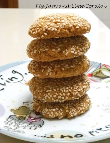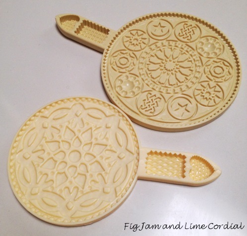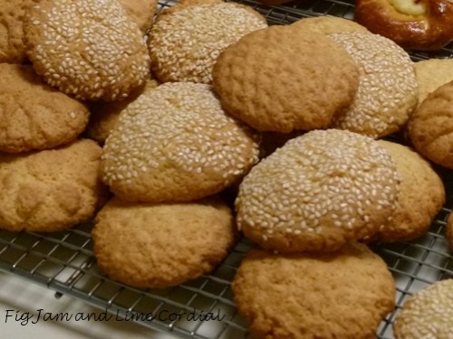 5. Roll the dough into smooth, walnut sized balls. Flatten them out, dip them in sesame seed and lay them on the parchment lined trays, allowing a little room for spreading. The sesame seeds are optional, and the cookies are also quite nice without them. I bought decorative moulds at Harkola, and pressed some of the dough balls against them to form a patterned top – although a lot of the detail is lost as the dough bakes…