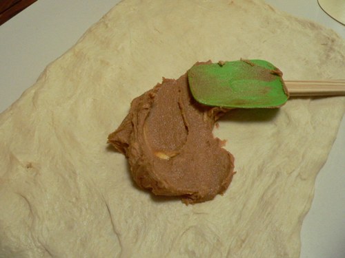 2.  Oil a clean bench, then press the dough into a large rectangle.  Mix together the remaining butter, white sugar and cinnamon, and spread over the dough, then roll up tightly.