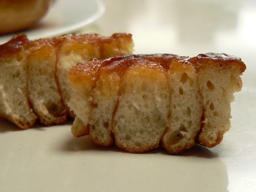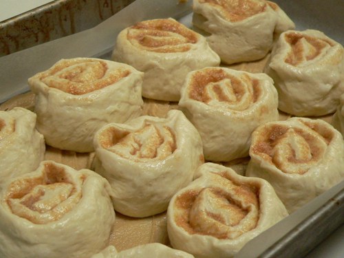 3. Slice the dough into twelve rolls, and position them over the butter and sugar paste in the baking pan.  Cover and allow to rise for about 30 minutes.