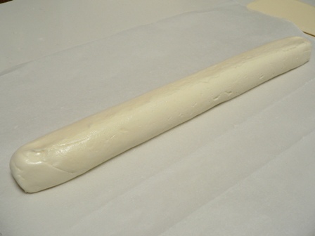 2. Shape the mix into a long thin log (mine was about 2.5cm/1″ thick) and wrap in parchment paper, twisting the ends to seal.  Chill in the fridge for about an hour.