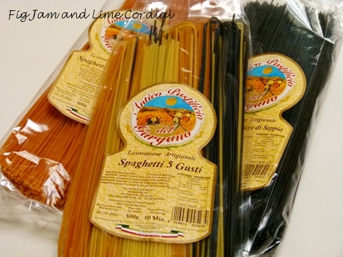 …are interesting packets of Italian spaghetti. The squid ink is absolutely delicious with a seafood sauce, but we’ve yet to try the chilli pasta or the five flavoured combination (chilli, squid ink, spinach, turmeric and plain)…