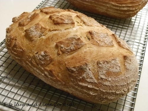 …is an experimental loaf of sourdough, made with 30g of leftover drippings from a recent lamb roast and lots of garden rosemary. The crumb is tender and the crust quite thin and crisp – probably as a result of the lard. It was delicious with pumpkin soup, but as usual with all things lardy, Pete was grossed out…