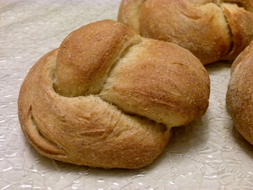 …I’ve been baking knotted rolls! Using my latest bread formula, I shaped the proved dough into baguettes and let them rise a second time. Just before baking, I tied the long rolls into knots. It was easy and fun to do…