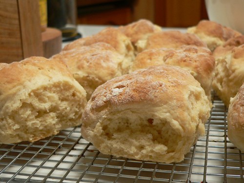 5. Lightly roll the dough to a thickness of about 2½ cm (1″). Using a well-floured round cutter, cut the dough into circles, taking care not to twist as you push down (which apparently retards the rise). Lay the scones on the parchment-lined tray and brush the tops with a little milk. Bake for 20 – 25 minutes, or until (hopefully) well-risen and golden brown.
