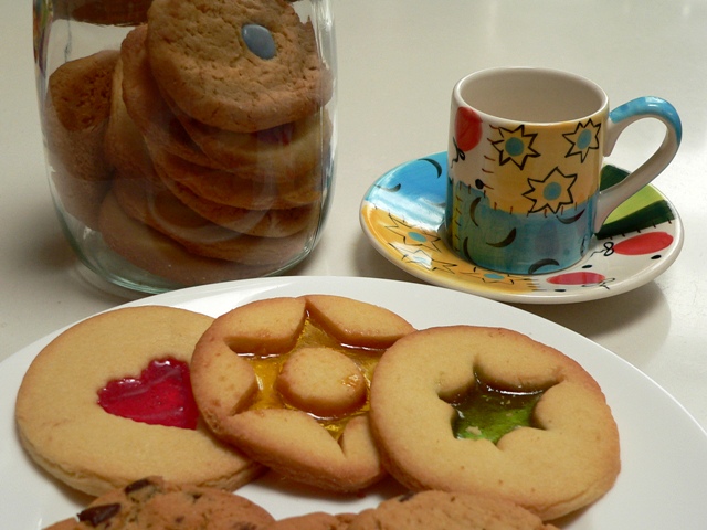 My wonderful cousins gave us a set of hand-painted espresso cups and a jar of homemade cookies, which included these beautiful stained glass treats.