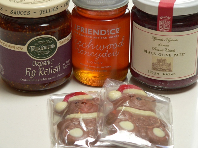 Gourmet treats from Cliff and Kathy included jars of organic fig relish, black olive pate, and New Zealand Beechwood Honeydew honey. The honey is unique in that it’s not created from the nectar of flowers, but rather from the excretion of tiny insects that feed on the bark of the beech tree.