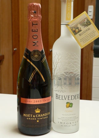 Finally, a couple of very special bottles – the 2003 vintage rosé Moët & Chandon is a gift from the gorgeous Terri, and the citrus (lemon) vodka was given to us by our old friends and neighbours, PeteV and Nic. Does anyone have suggestions of what I can use the vodka for? I don’t need any help with the Moët…