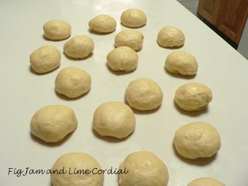 3. Turn the risen dough out onto an oiled bench and divide it into 18 x 50g pieces. Shape each piece into a ball.