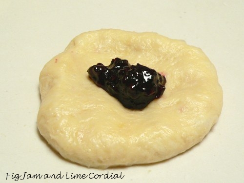 4. Turn each ball seam-side up, and flatten it out. Spoon a scant teaspoon of blackberry jam into the middle of the circle…