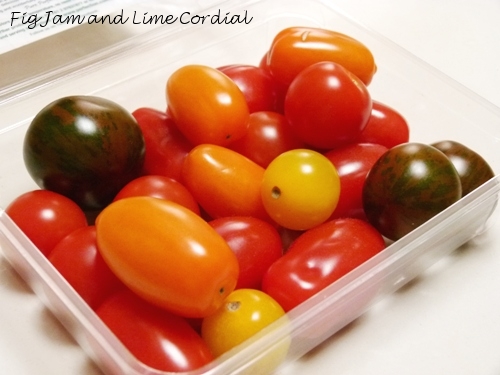…is an indulgence in tomatoes. We were really missing good tomatoes, so we bought this mixed box from an expensive fruit market. It was worth it too, as every single tom was delicious. The box had an assortment of red and yellow cherries, red and yellow Bella Rossas and Black Zebras…