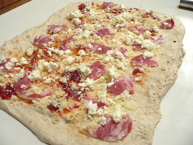 Apart from the nitrites in the ham (which I grit my teeth and accept) and the salt in the olives, there aren’t any other preservatives in the meal – no hidden chemicals or food additives with strange numbers. The ingredients are all topnotch and I’ve reduced the salt in my standard dough, resulting in bread which is 30% less salty than commercial loaves. I know it’s not a big deal in a roll stuffed with ham and olives, but every little bit helps.