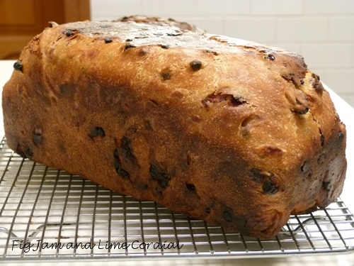 I omitted the salt crust this time. There was enough dough for one large tinned loaf and a smaller freeform one. I baked them at a slightly lower temperature (200C with fan) to prevent the fruit from burning, and as a result the loaf in the tin needed a slightly longer baking time. The little loaf burnt anyway, but the gerry-rigged pullman tin seemed to protect the crust of the larger loaf as it baked.