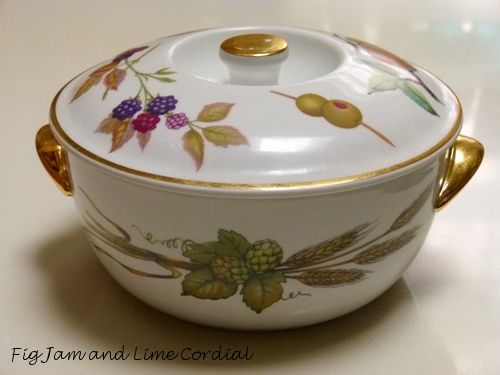 …is a very old Royal Worcester Evesham Gold casserole pot – a wedding gift from Auntie Anna. We’ve used it until the gold is chipping off…